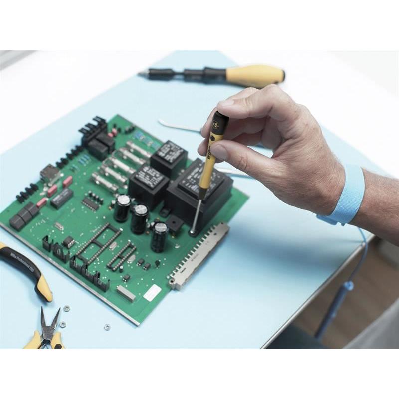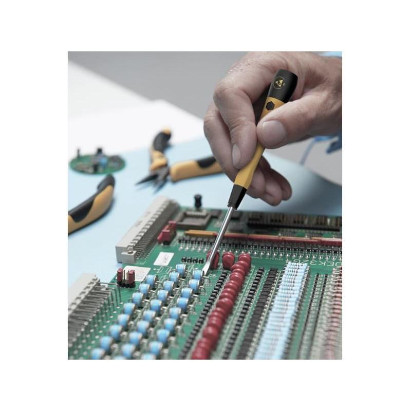 A dissipative tool safely channels electrostatic energy away in a controlled fashion. Manufactured in compliance with international IEC standard 61340-5-1, thus guaranteeing maximum protection for electronic components. These screwdrivers have a surface resistance between 106 and 109 ohm.